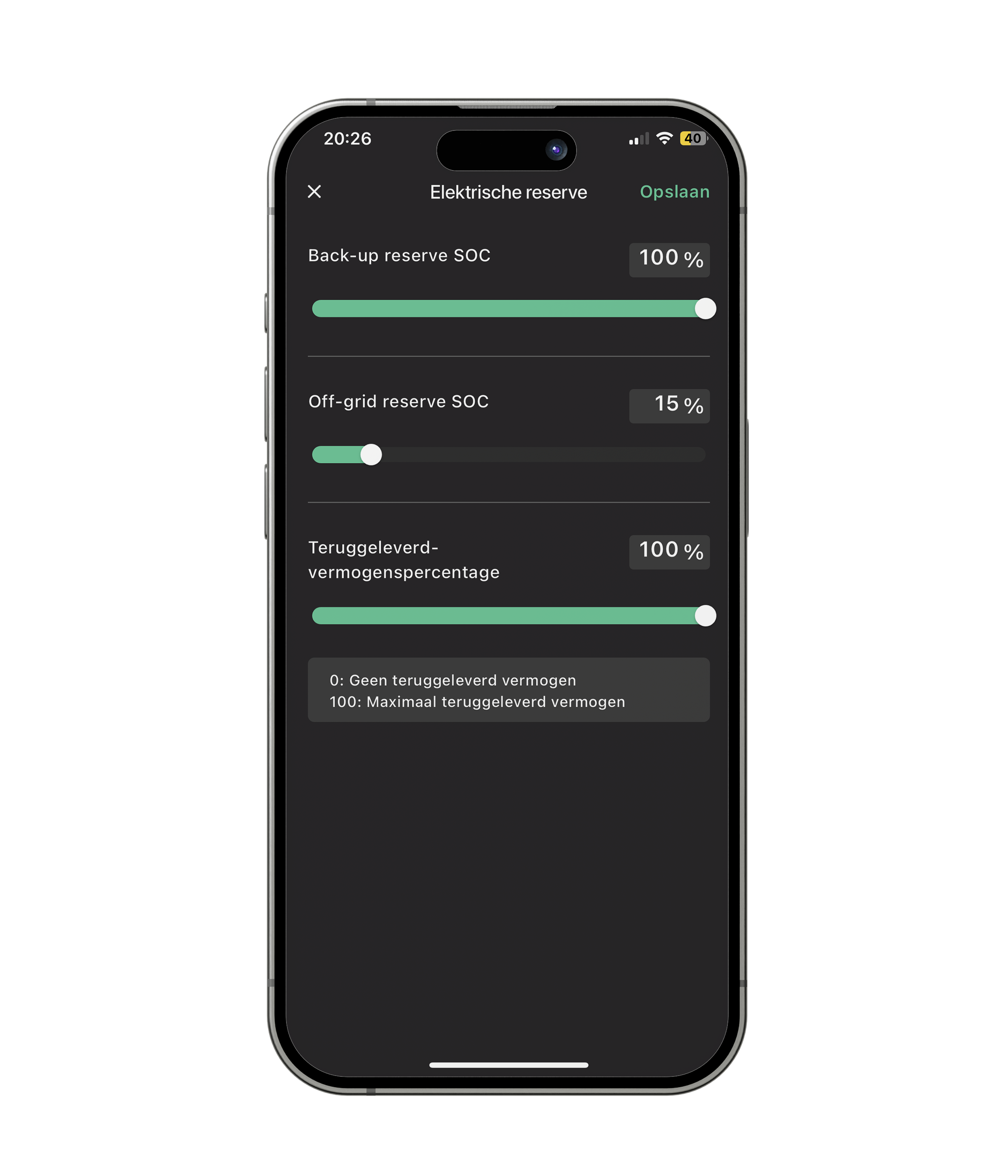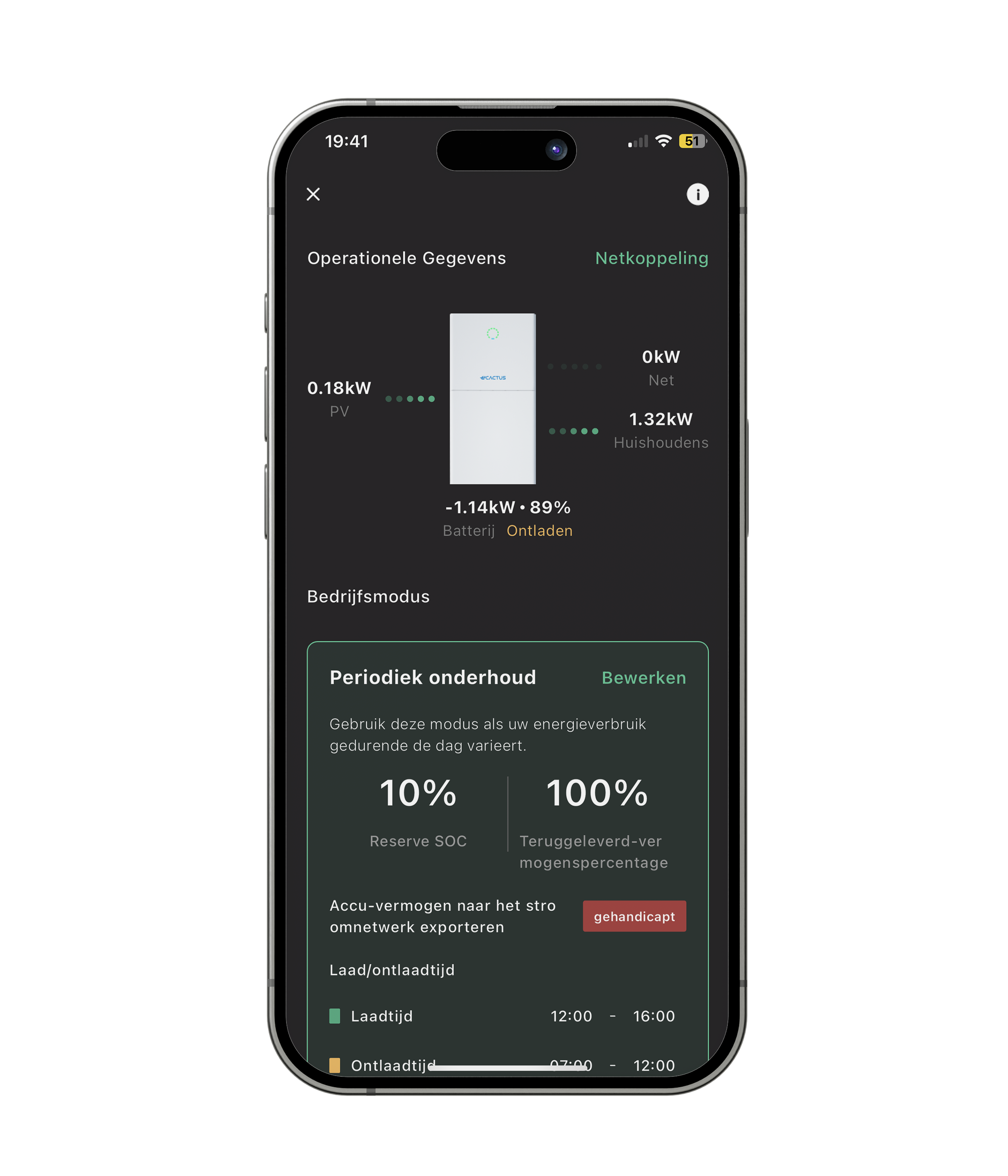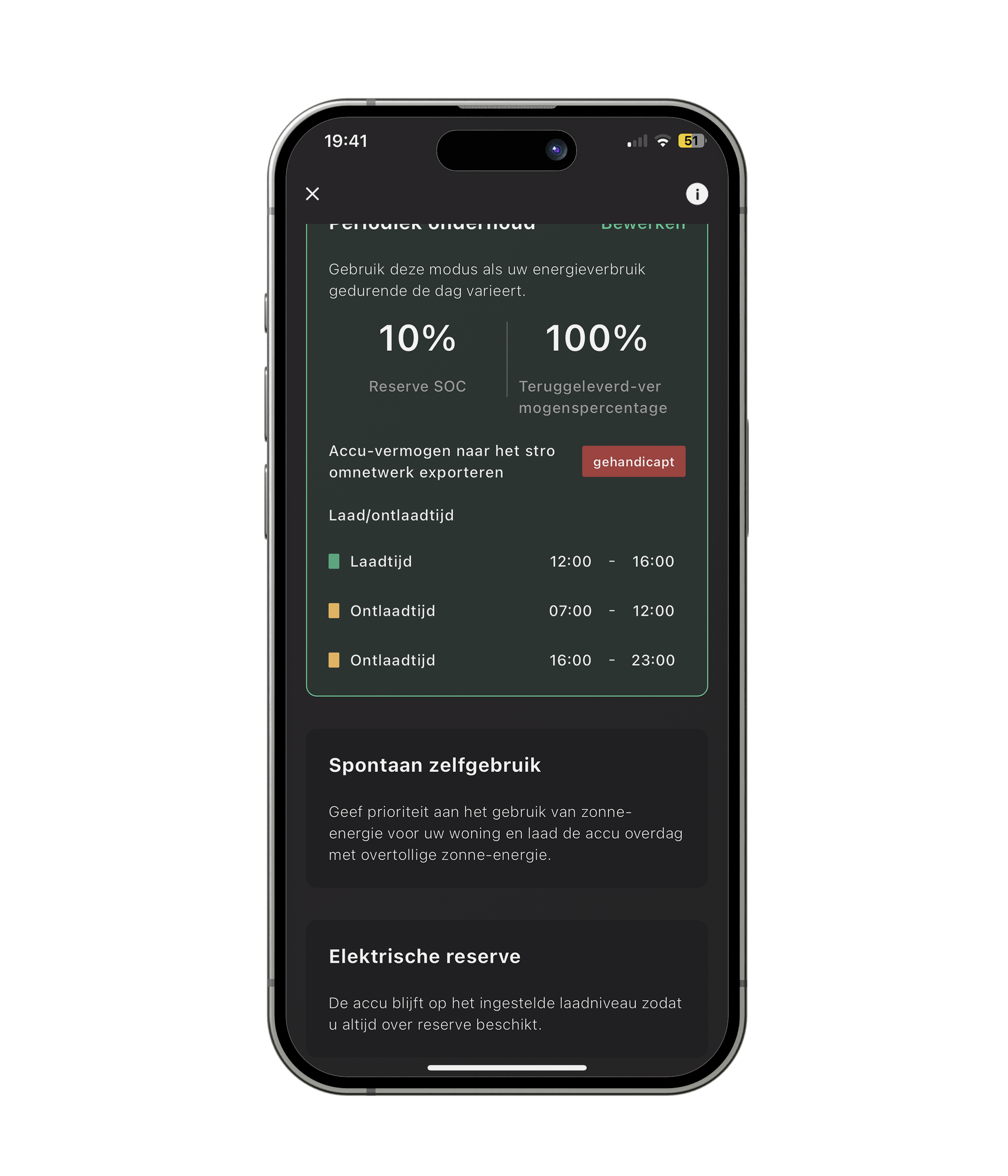 Met de bedrijfsmodus heb je zelf de keuze om te kiezen welke instellingen het beste bij jouw situatie passen. Pas eenvoudig de modus aan om optimaal gebruik te maken van je thuisbatterij en zonne-energie.