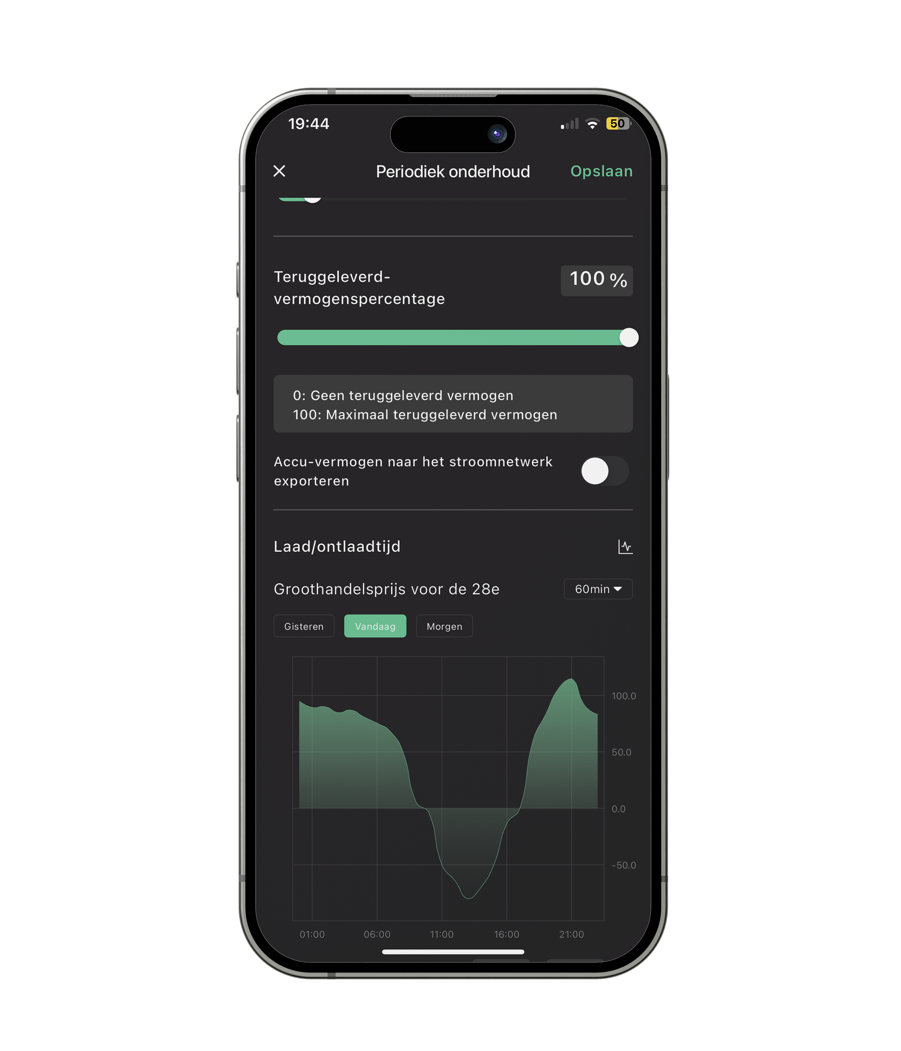 In combinatie met een dynamisch energie contract die je zelf afsluit zorgt de applicatie ervoor dat je automatisch altijd de goedkoopste energie inkoopt, verbruikt en/of opslaat. En mocht je zelf willen beslissen om de thuisbatterij eerder op te laden, dan kun je de tijden zelf aanpassen. Ook het verkopen van energie heb je zelf in de hand!